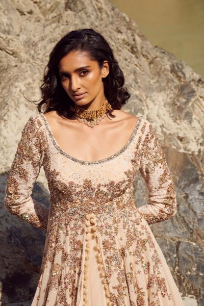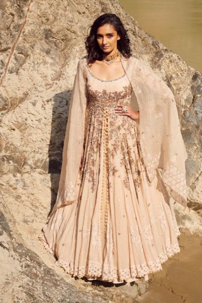Ivory Silk Chiffon Kamdani Chikankari Jacket with Chikankari Kamdani chiffon Lehenga and organza dupatta.