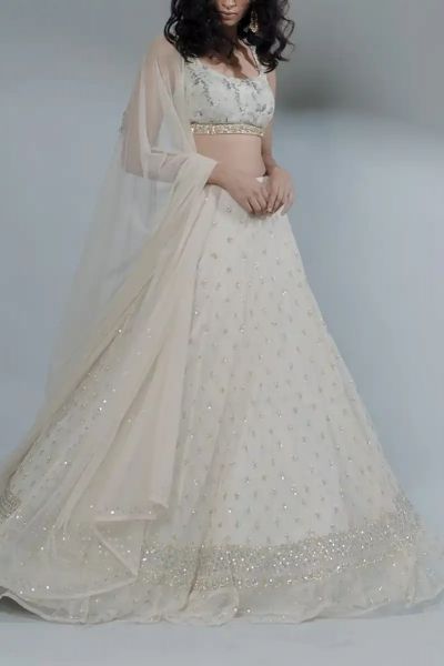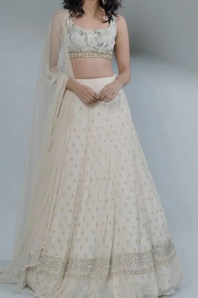 White bootie lehenga set, combined with gold color work all over lehenga.