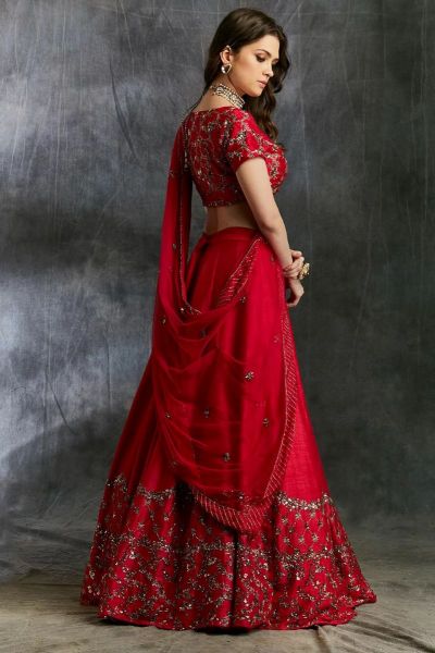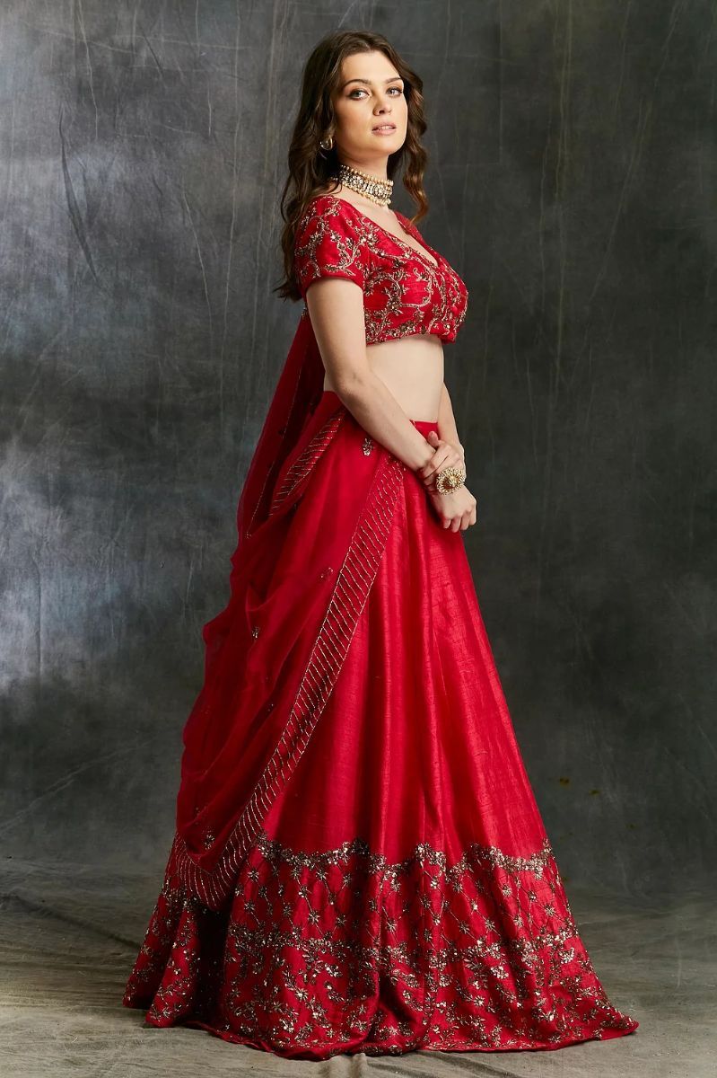 Raw silk dark pink lehenga with embroidered choli and border on lehenga. Comes with four side embroidered dupatta.