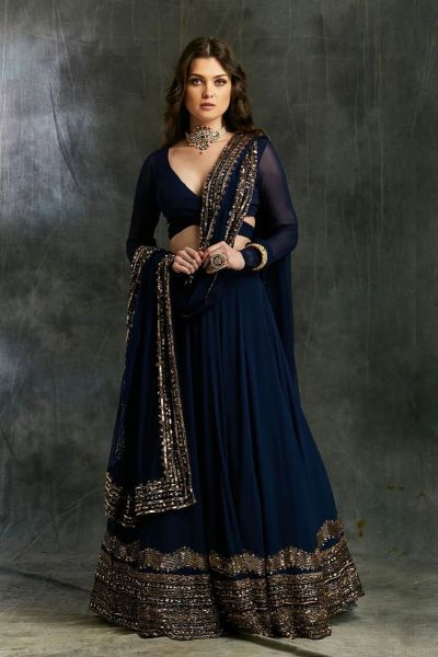 Midnight blue georgette lehenga with a wrap blouse. The lehenga has thick gold handwork with sitaara and nakshi details teamed with georgette dupatta with work.