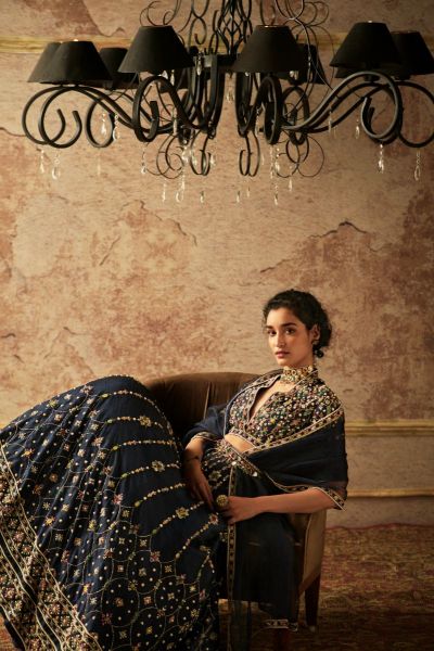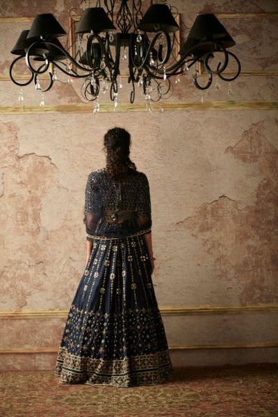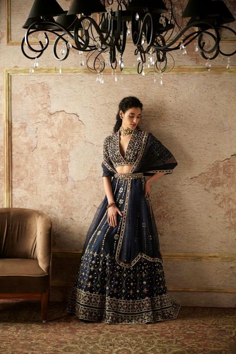 An embroidered jewelled blouse, embroidered organza dupatta, and a jewelled belt complete this navy raw silk lehenga.