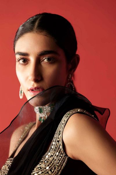 Black embroidered chanderi blouse paired with a draped chiffon and organza saree.
