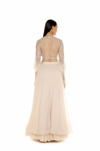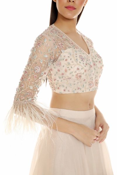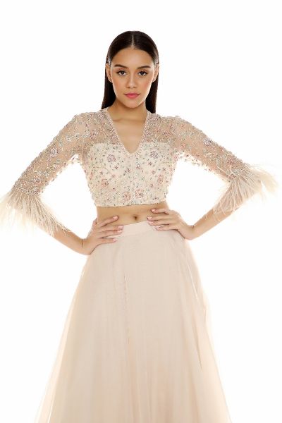 Chintz embroidered blouse with feather sleeves and organza skirt.