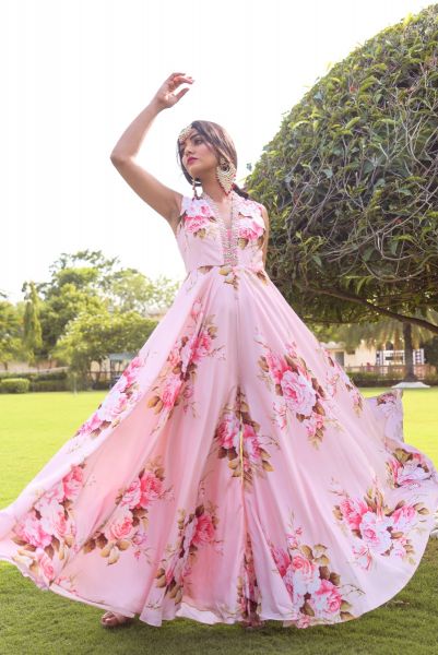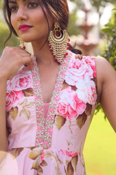 Crepe baby pink printed body with hand embroided plunge neckline and attached crepe printed jumspuit.