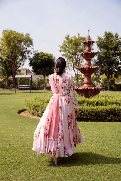Crepe baby pink floral printed anarkali with highlighted body. Comes with a rose pink hand embroided net dupatta finished with pearls and a hand embroided floral belt. Lycra stretch net churidar completes the look.