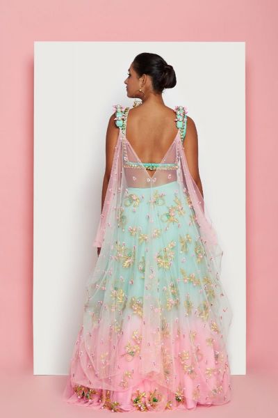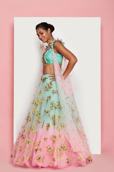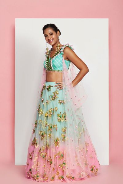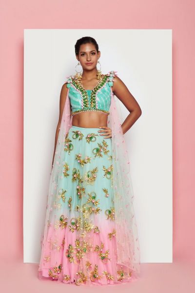 A dip dyed mint to neon pink lehenga embellished with gold metal ring and bead motifs paired with a leheriya blouse having a chunky ornated neckline and a matching dip dyed cape