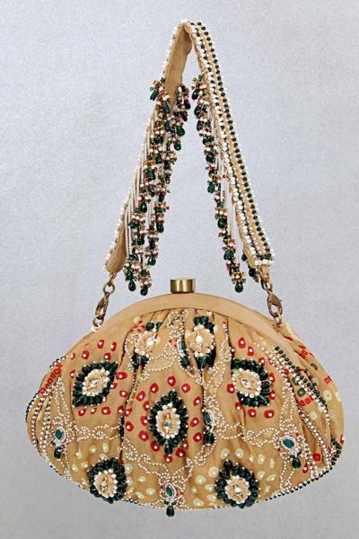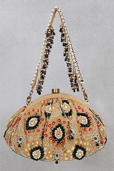 This classic pouch is delicately embellished with lustrous kundan stones, pearls, glass crystals, and velvet appliques, paying homage to our heritage. Indian arts and crafts.