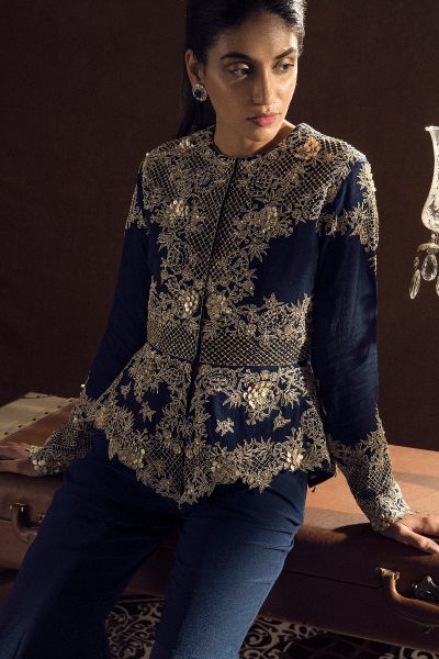 Blue Dori, zardozi, and metallic sequins embroidered peplum top, it is paired with 2 layered flared pants in crepe.