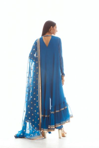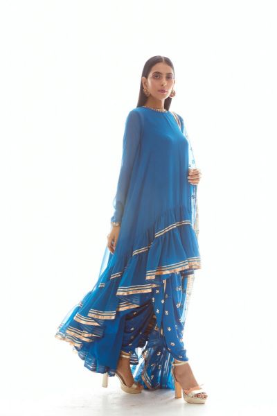 Tiered asymmetric kurta featuring floral embroidery and lace accents, teamed with dhoti pants and a dupatta. Style the look with a pair of jhumkis.