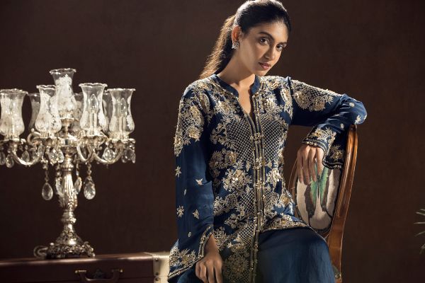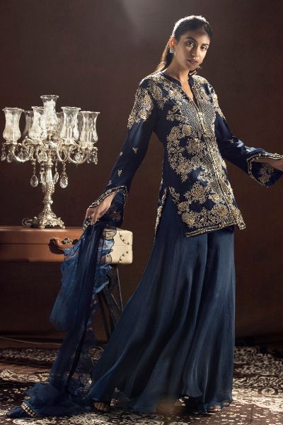Blue Dori, zardozi, and metallic sequins embroidered straight Kurti, it is paired with an organza palazzo.