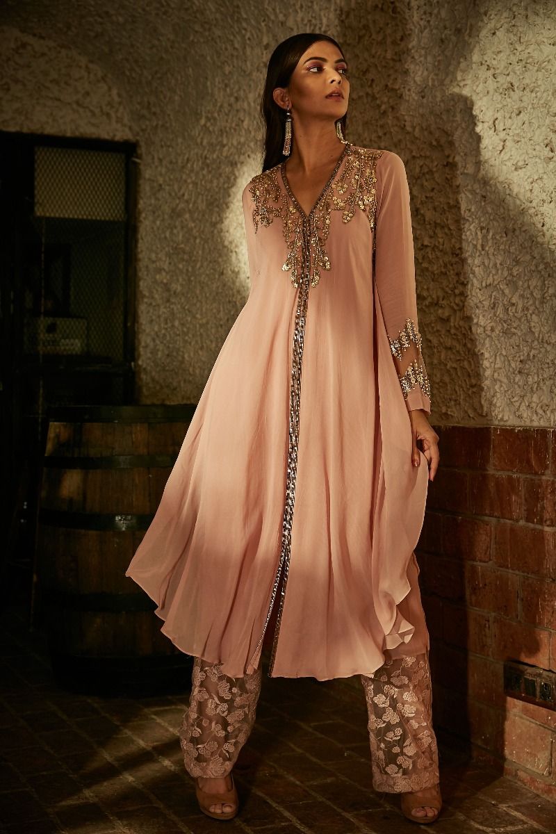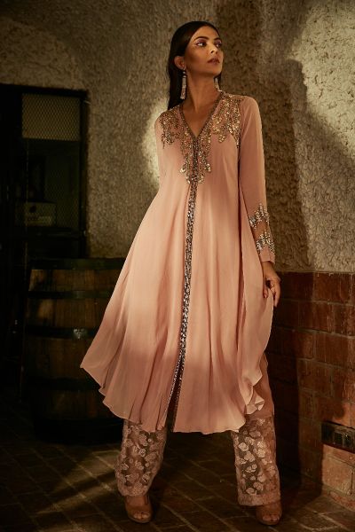 Blush Pink Organza Ruffle Top With Floral Embroidery Paired With Organza Plazo.