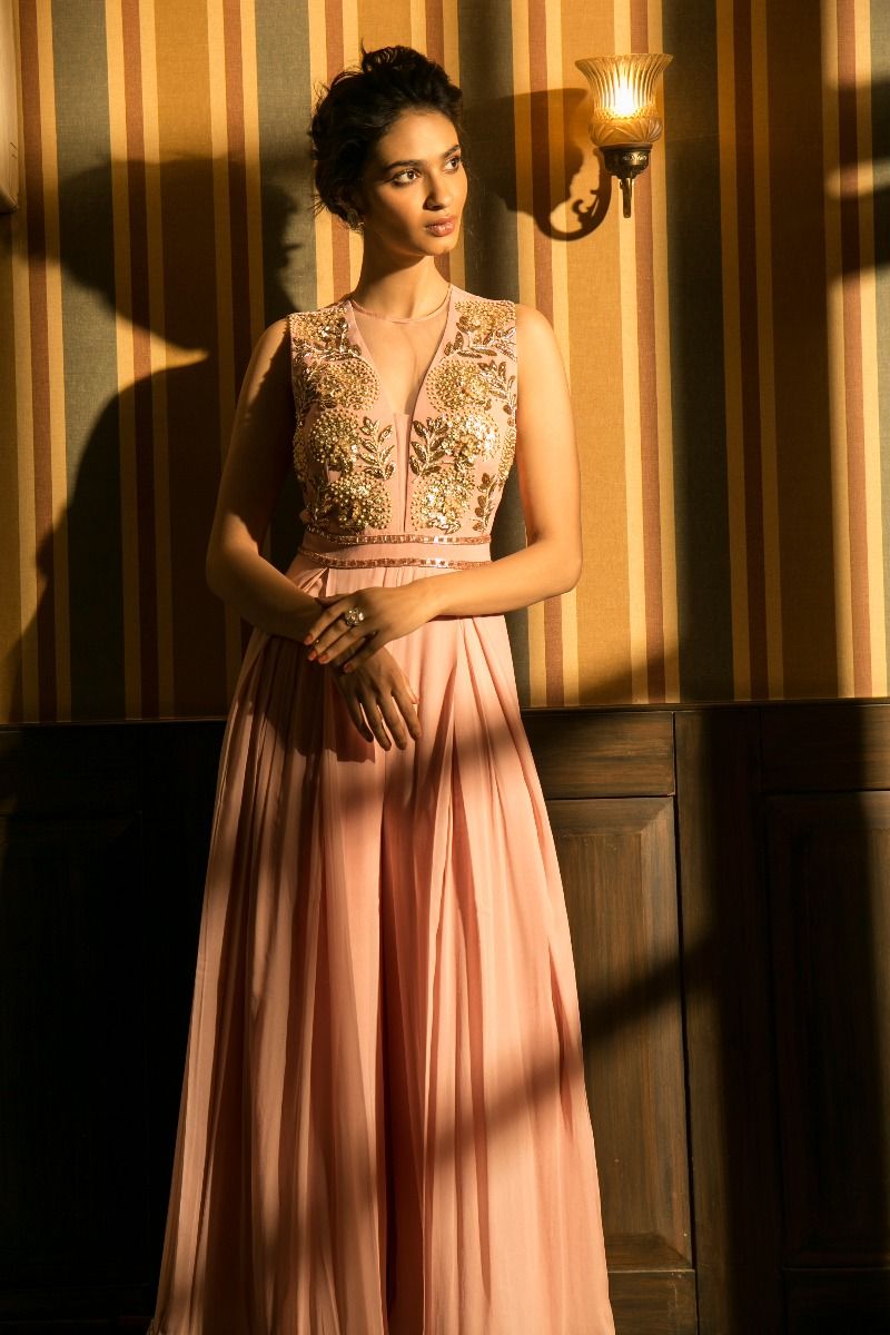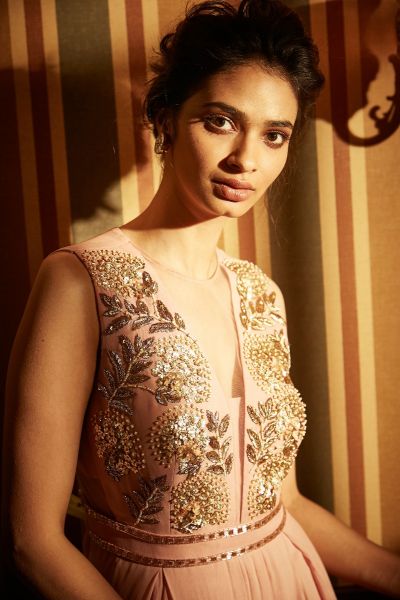 Blush Pink Floral Sequins Embroidered Box Pleated Jumpsuit
