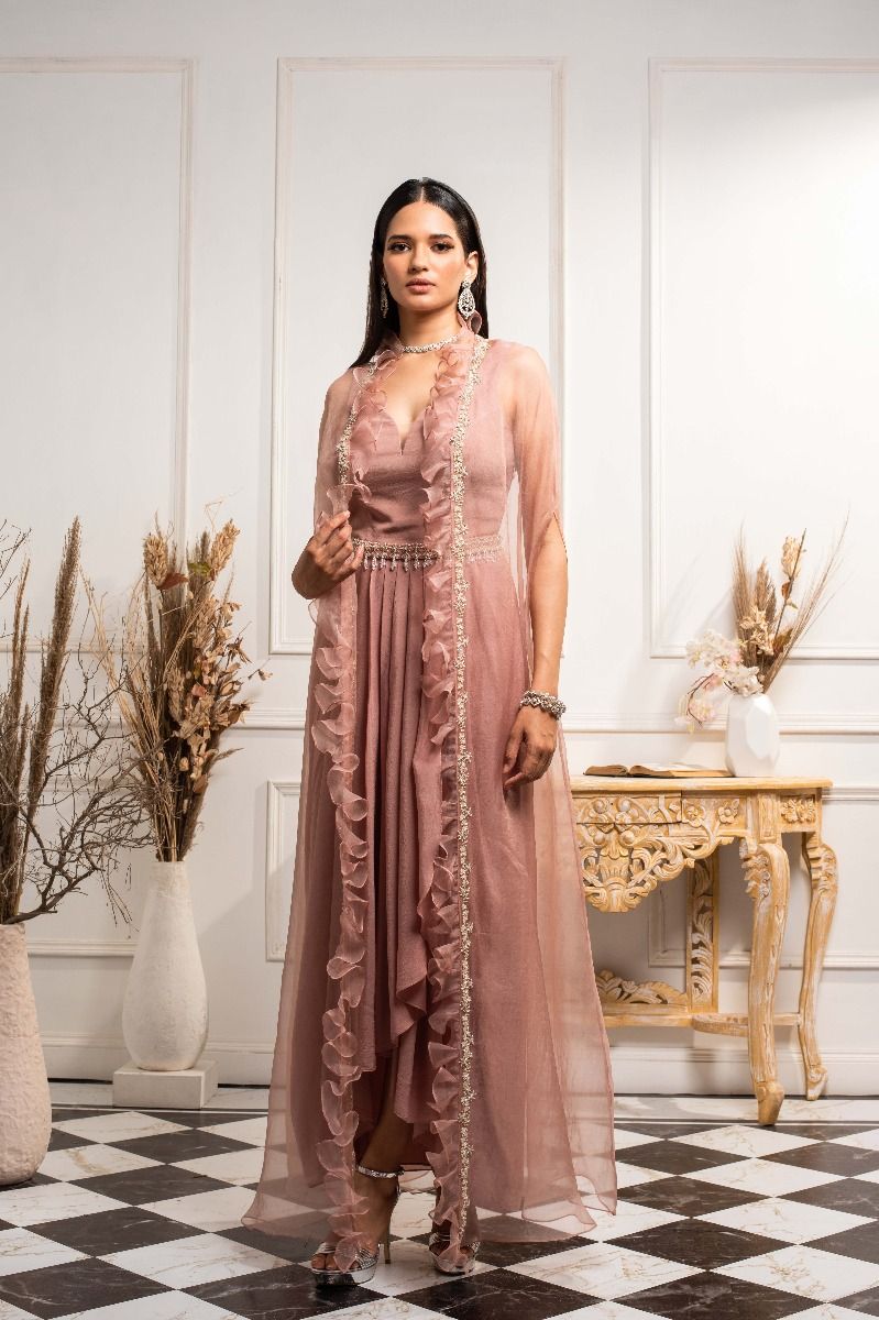 BLUSH PINK DRAPE DRESS WITH RUFFLE JACKET
