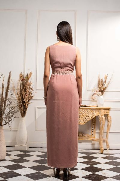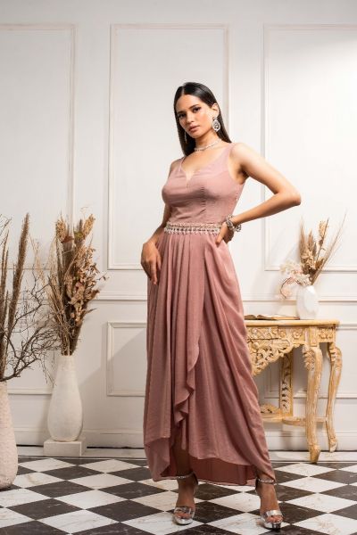 Pink pleated dress with ruffle jacket paired with an embellished belt.
