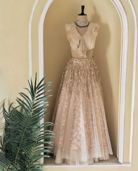 Pink Embroidered Lehenga in Net With Embroidered Threadwork Underlay and Frill Detailing Paired with an Organza Ruffle Top.