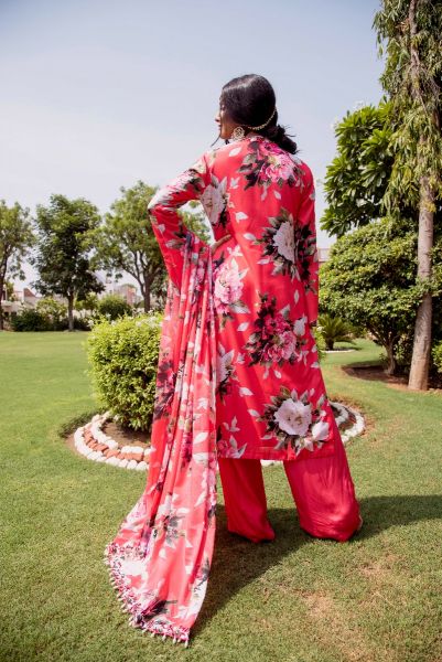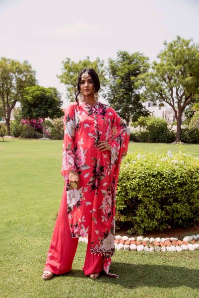Crepe bright pink printed tunic with flared sleeves and embroided neck. Comes with plain crepe straight pants and a chiffon printed dupatta hand embroided on 2 edges and finished with pearl drops.