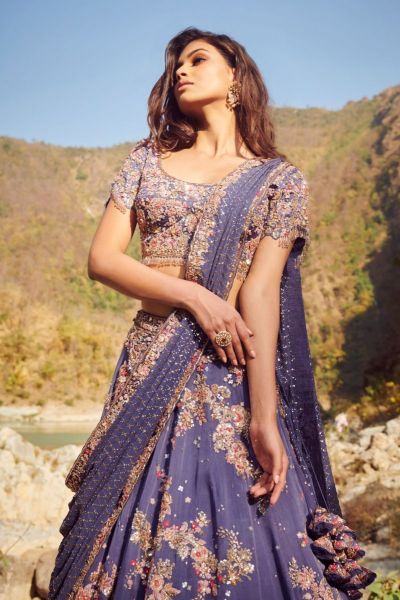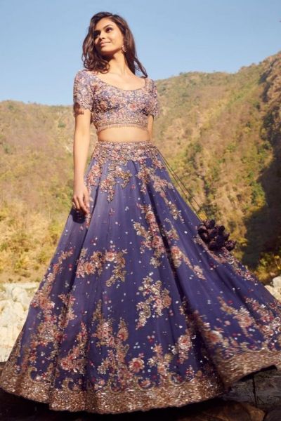 Dori and Zardozi embroidery on a blue silk organza lehenga set.