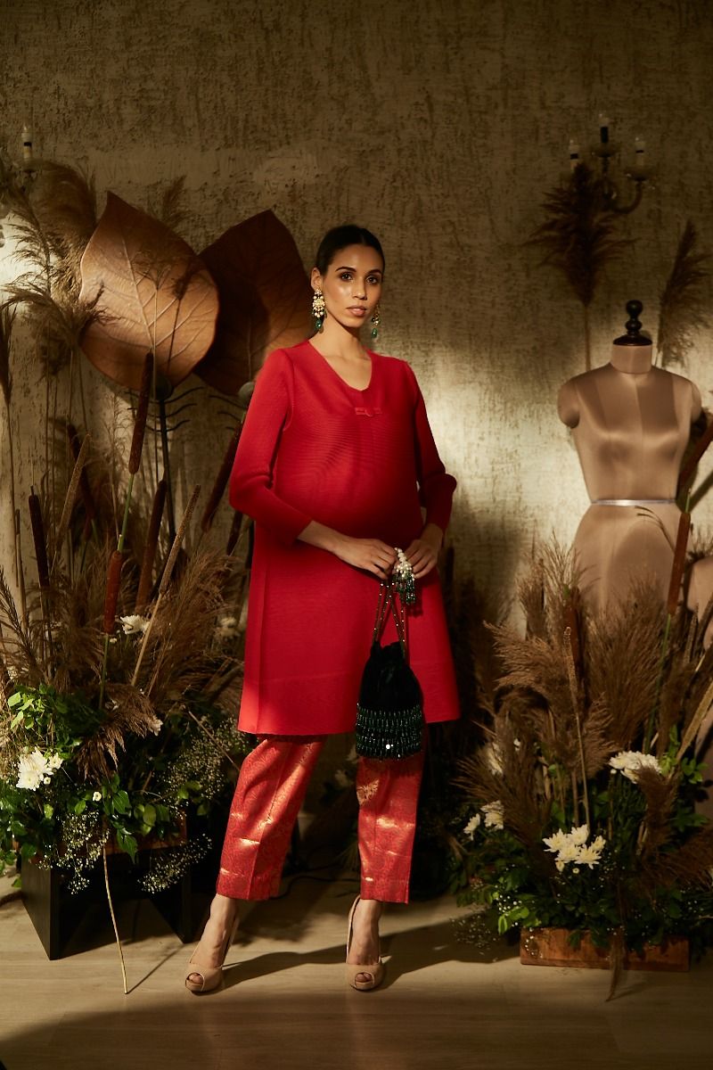 Chilli red flared kurta with all-over pleated detail. Paired with brocade pant.