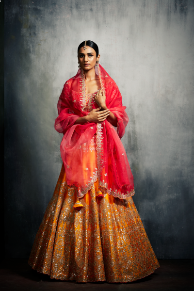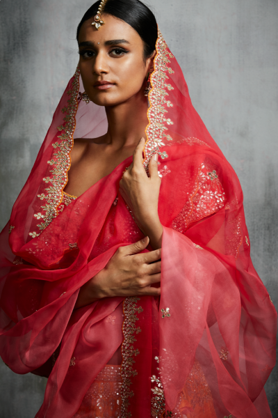 This lehenga set features conventional and refined gota patti embroidery in rich Indian hues and is paired with a red organza dupatta.