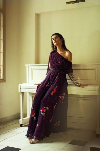 DEEP BURGUNDY ONE SHOULDER EMBROIDERED ANARKALI WITH DRAPE