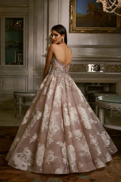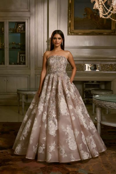 Mauve coloured Silk Organza jacquard Bridal gown with woven roses