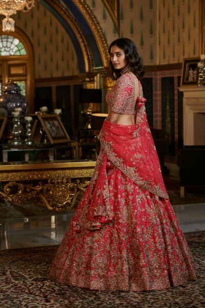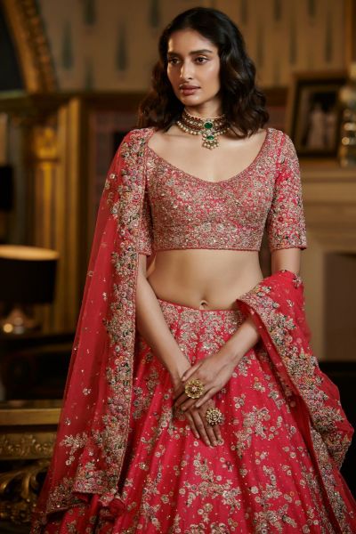 Fuschia Pink Raw Silk Bridal lehenga with Gold and silk thread Zardozi embroidery.