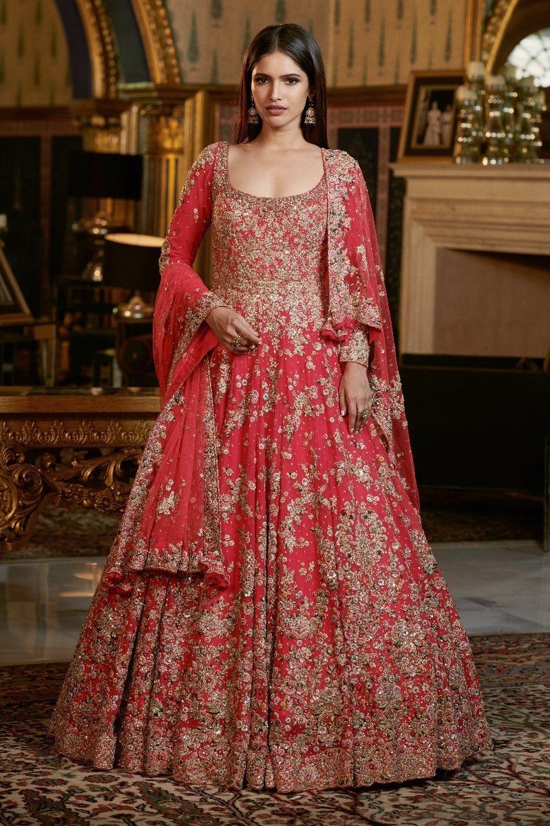 Fuschia Pink Chiffon Full Length Bridal Kalidar with silk & Kasab thread embroidery  and highlighted with gold zari and sequins