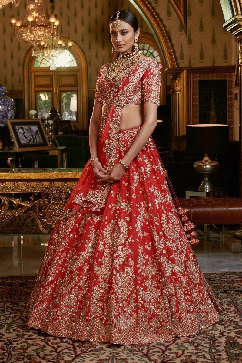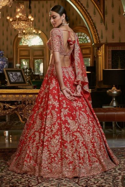 Red Raw Silk Bridal Lehenga with Gold and Silk thread embroidery highlighted with Zari, sequins and cut-dana. Teamed with an embroidered choli and an embellished dupatta.
