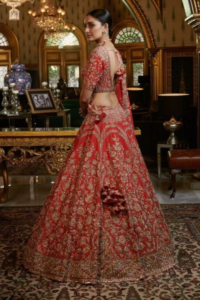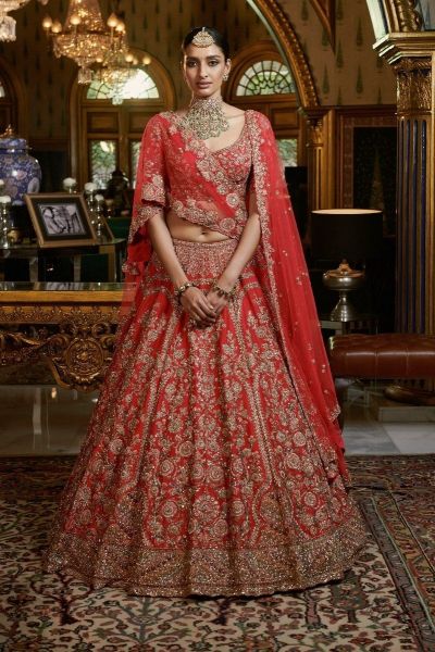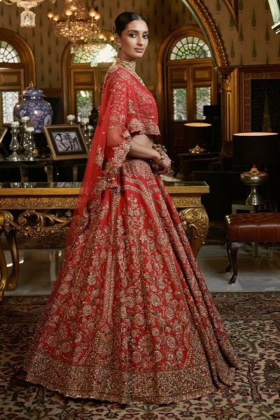 Red Raw silk Bridal Lehenga with Gold & Silk thread Embroidery