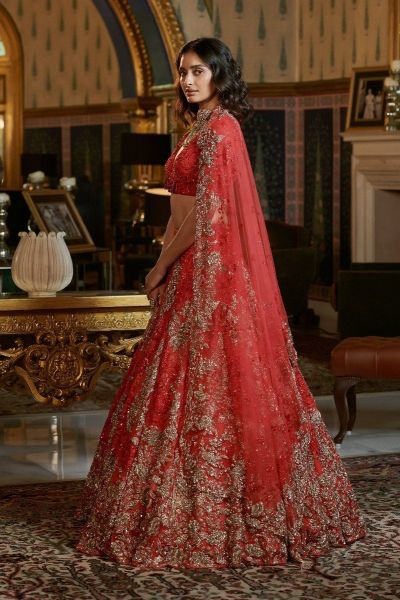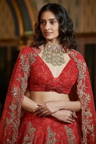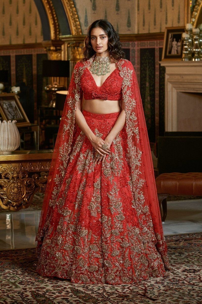 Scarlett Red Chantilly Lace Bridal Lehenga with Zardozi tone on tone & Gold embroidery