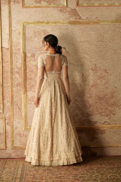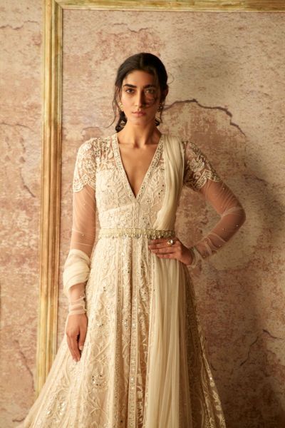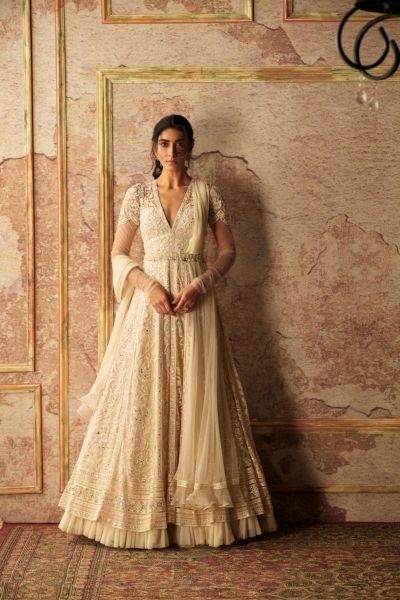 An ivory net embroidered anarkali with a matching net embroidered dupatta and embroidered belt.