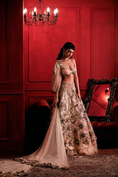 Not So Serious by Pallavi Mohan defines glamorous drama with this tulle layered lehenga and one shoulder blouse, featuring laser-cut applique work, featuring bugle beads, sequins, rhinestones and feather accents, teamed with a richly ornate tulle dupatta.
