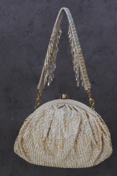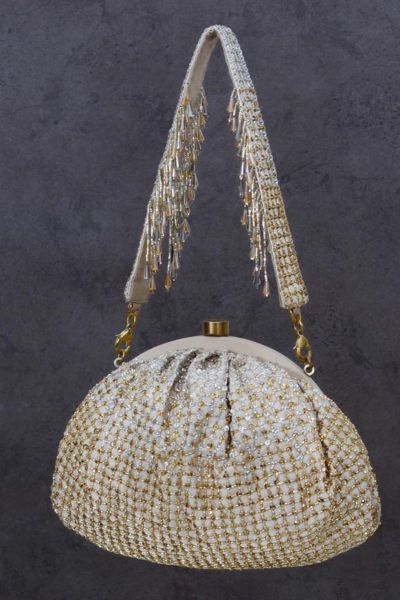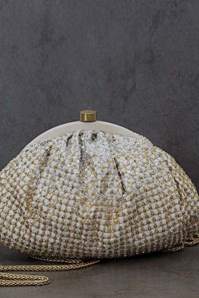 In a gold to silver ombré style, this luxe minimalistic pouch is decadently hand embroidered with an array of lustrous rhinestones and Japanese micro beads. It has a minimal yet glamorous look, inspired by the nostalgic 90s metallic chain mail. It can be worn in both traditional and modern outfits.