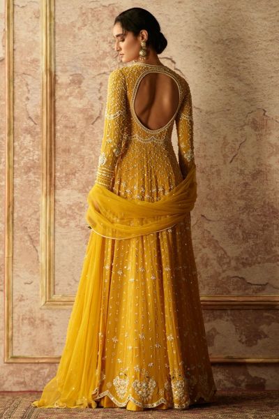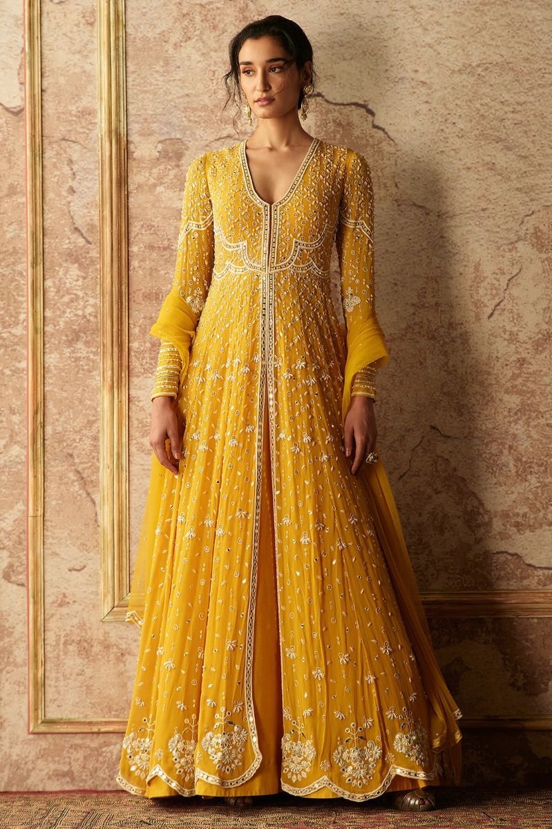 Golden yellow georgette embroidered anarkali paired with embroidered net dupatta.