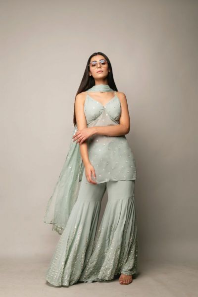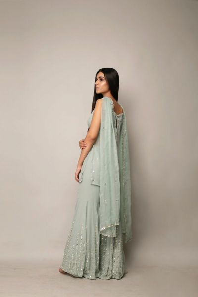 Sheer kurta with a bustier detail embellished with mirrors, sequins and thread. Flared sharara bottom featuring a striped patter embroidered with thread, sequins and mirror.