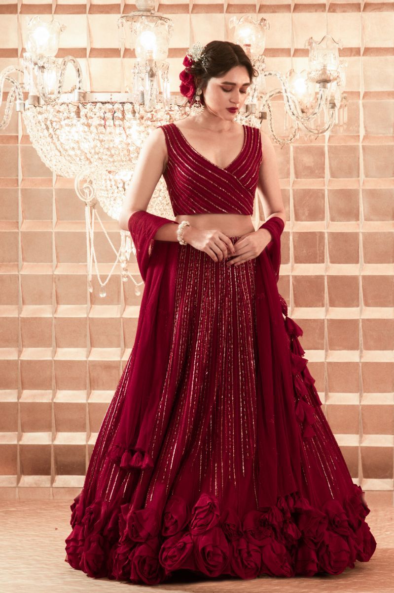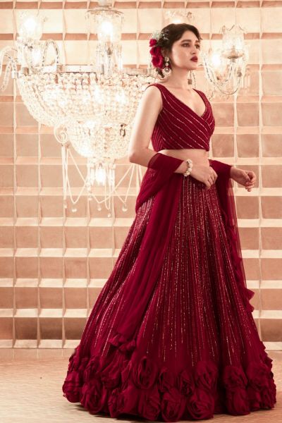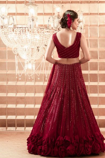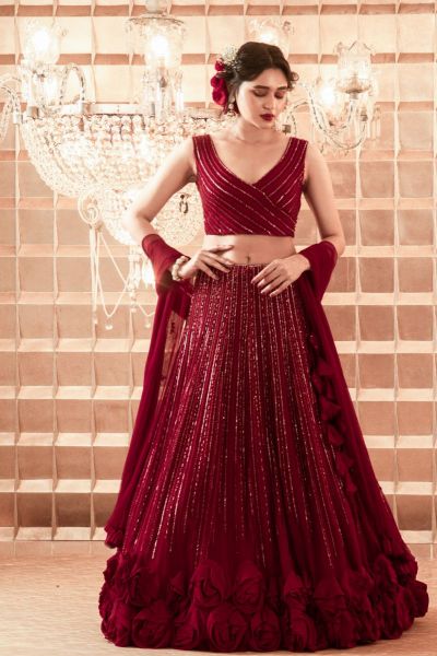 Maroon lehenga with cutdana and bead embroidered motifs. Comes with blouse and dupatta.