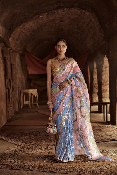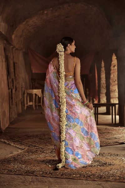 Vibrant sari with honeycomb mesh effect on the pallu, featuring lampi highlights and stripes on the drapes, teamed with an embellished blouse. Style the look with a Swarovski necklace set.