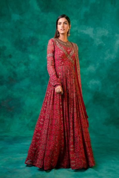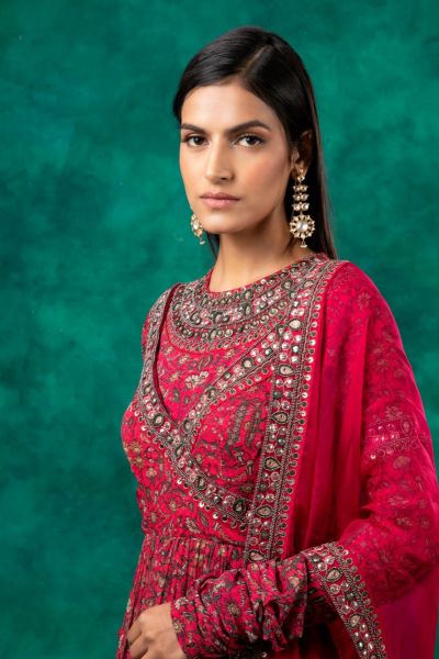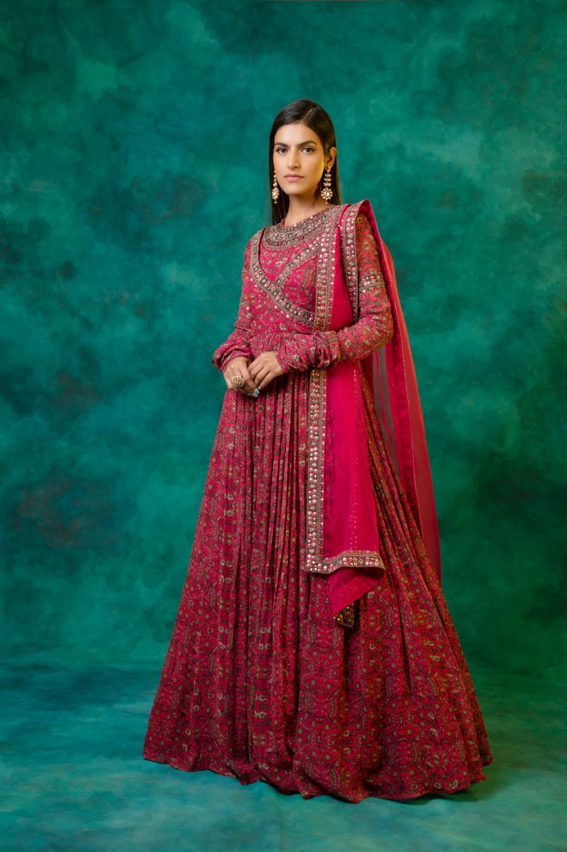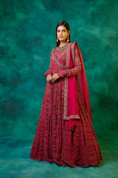 Featuring a hot pink georgette anarkali with an organza base and embellishment. It comes with a dupatta that matches.