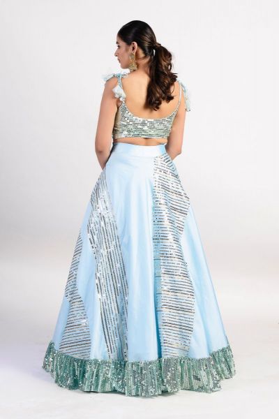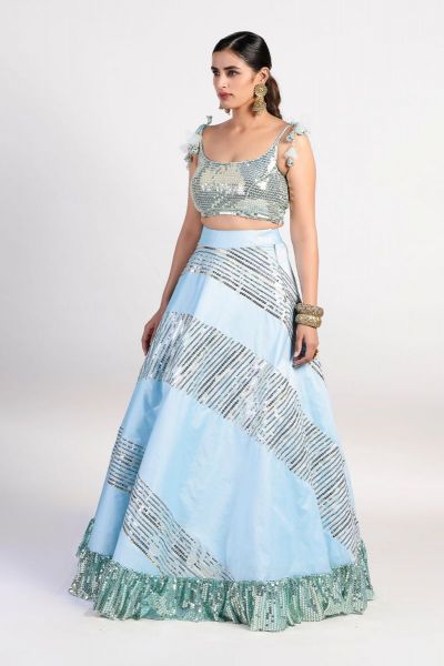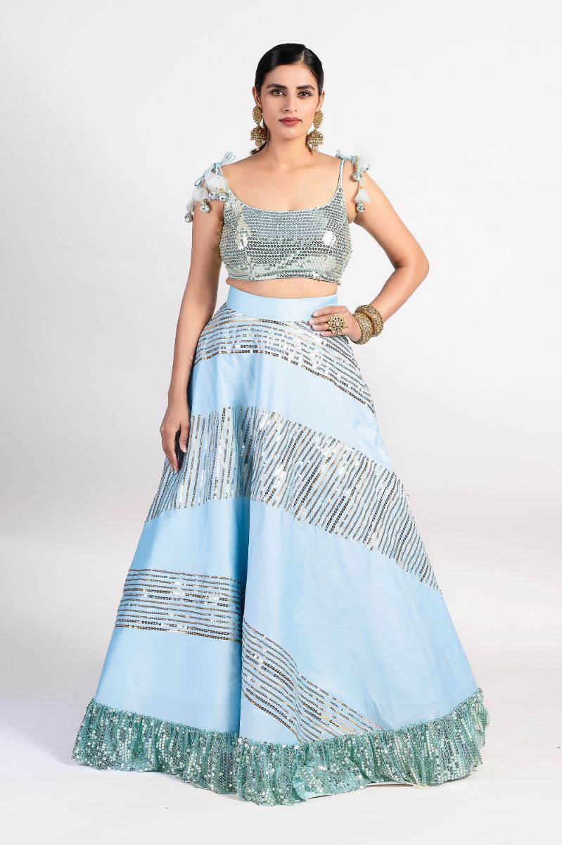 Ice blue lehenga with all-over sequin work in diagonal striped pattern & flounce frill hem. Comes with sleeveless tassel tie-up knotted shoulder straps blouse.