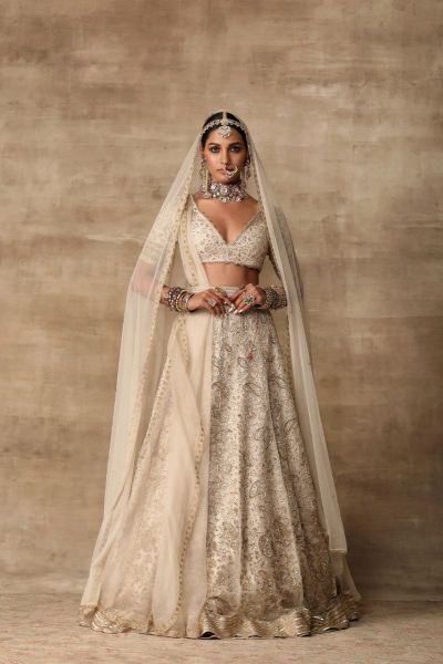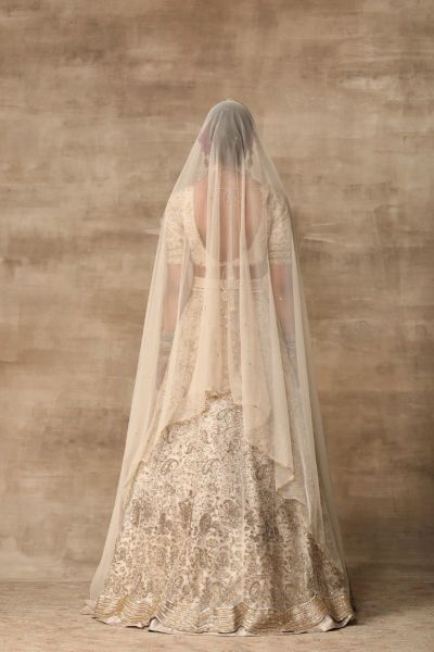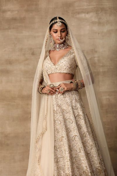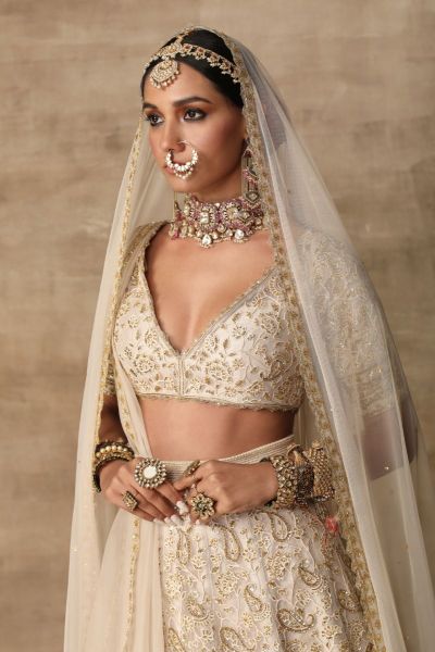 Ridhi Mehra creates a dreamy and timeless lehenga set with embroidered paisley motifs and tulle dupatta and belt. A polki necklace collection completes the look. The veil is purely decorative.