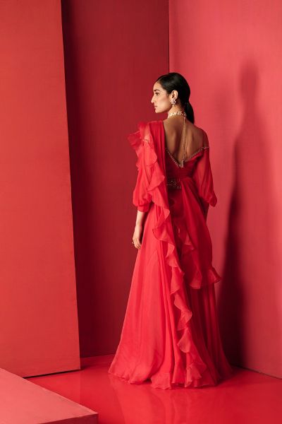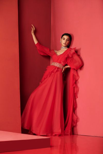 Poppy red chiffon-organza jumpsuit and dupatta paired with an embroidered belt.