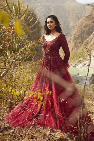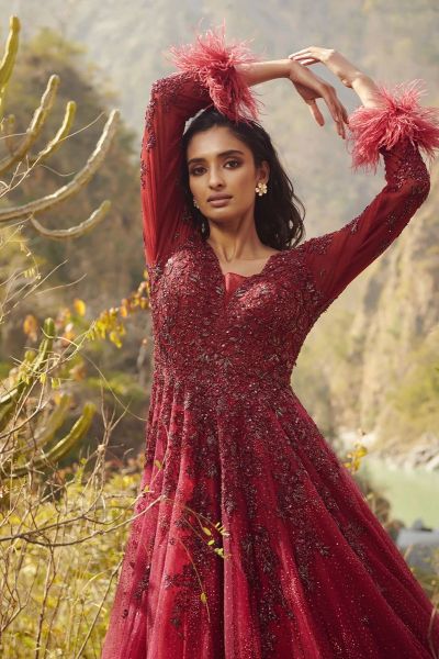 A beautiful Plum Shimmer Tulle gown with french sequins 3D embroidery. Perfect for evening events.