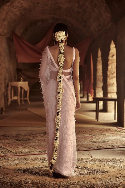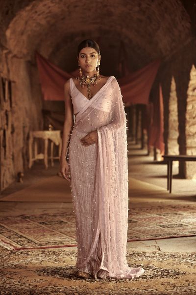 This dreamy pastel silk organza and pure crepe sari with crystal droplets and lampi stripes, teamed with a raw silk blouse. Style the look with a polki choker necklace.