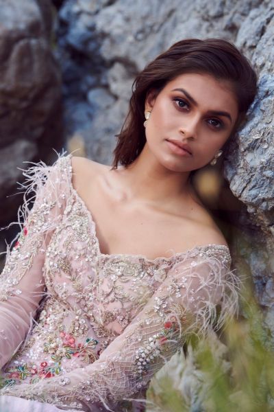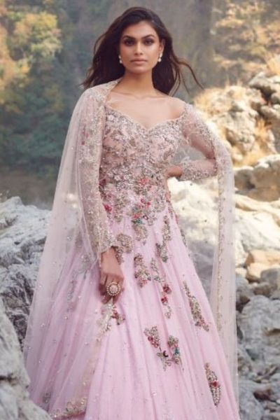 With a tulle Dupatta, this powder pink silk chiffon Chikankari Kalidaar collection features Zardozi embroidery.