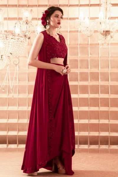Maroon lehenga with draped detail. Comes with blouse and jacket.
