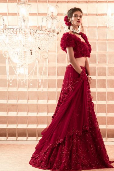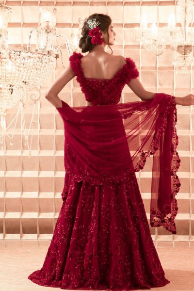Maroon lehenga with all over cutdana embroidered floral motifs. Comes with blouse and sheer dupatta.