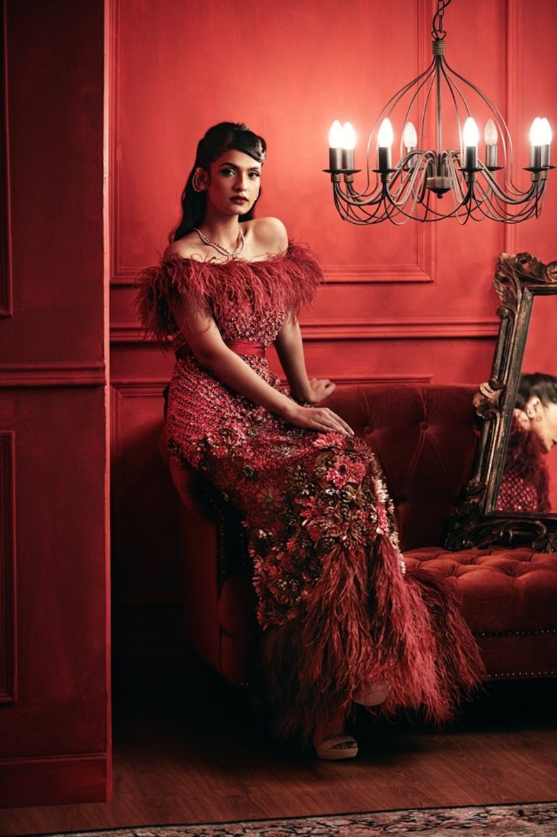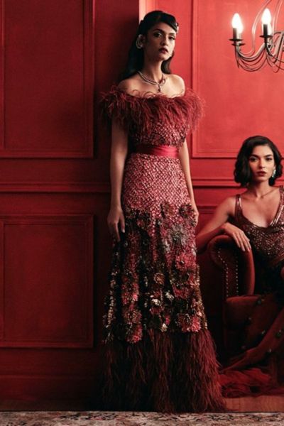 Featuring mimosa dress, adorned in deep wine/maroon  laser cut petal and floral detail hand work, highlighted with fine bugle beads, rhine stones and feathers.