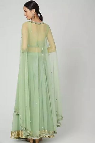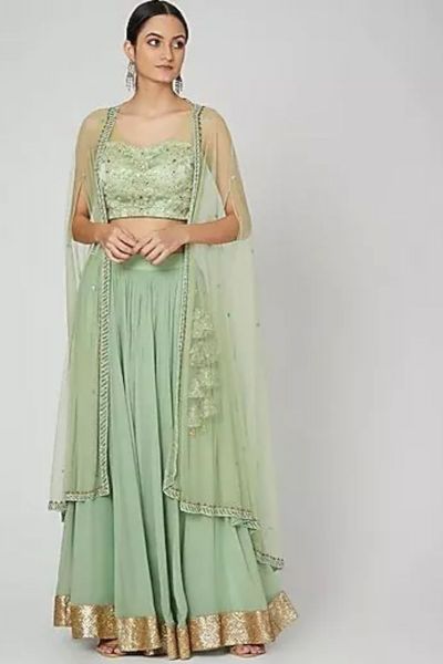 Lime green lehenga with all-over gold-silver sequin work in striped pattern. Comes with corset-style bandeau cropped blouse.