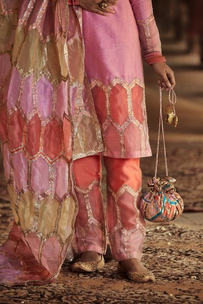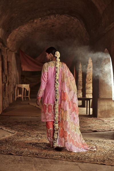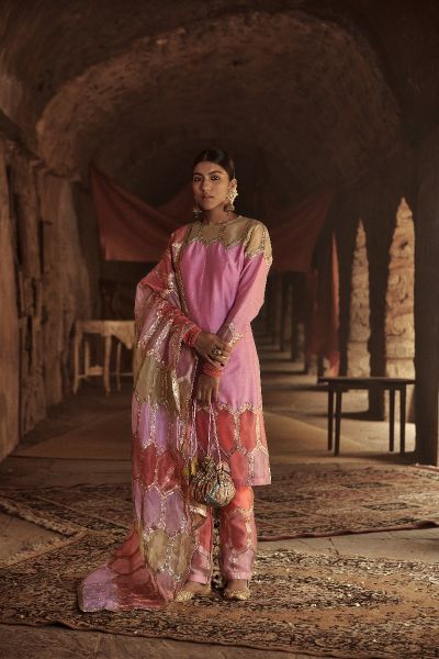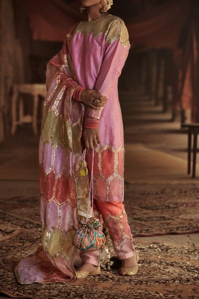 A classic chanderi kurti with stained glass mesh pattern, featuring lampi detailing, teamed with a matching dupatta and stained pants. Style the look with chandbaalis.