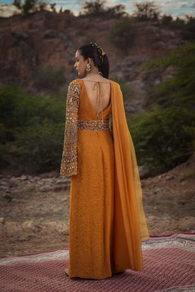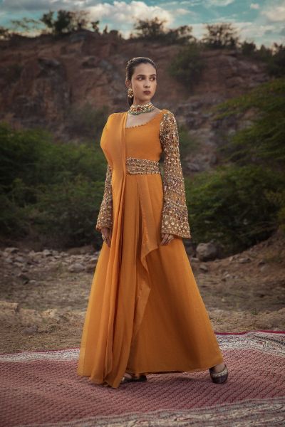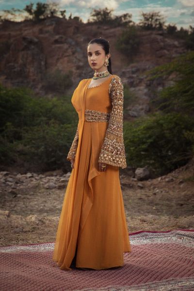 Pre-draped sari with exaggerated cutwork and embroidery accents on sleeves, paired with an embroidered belt. Style the look with polki earrings.